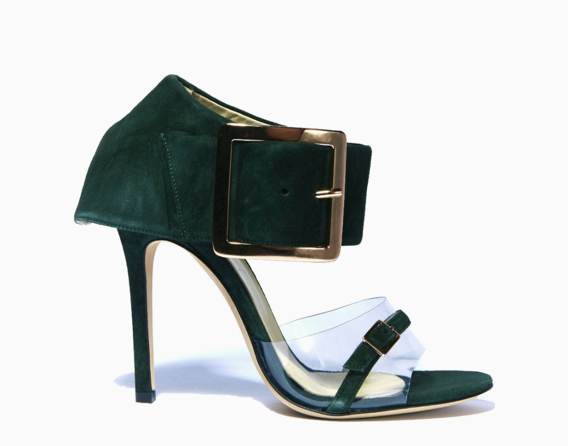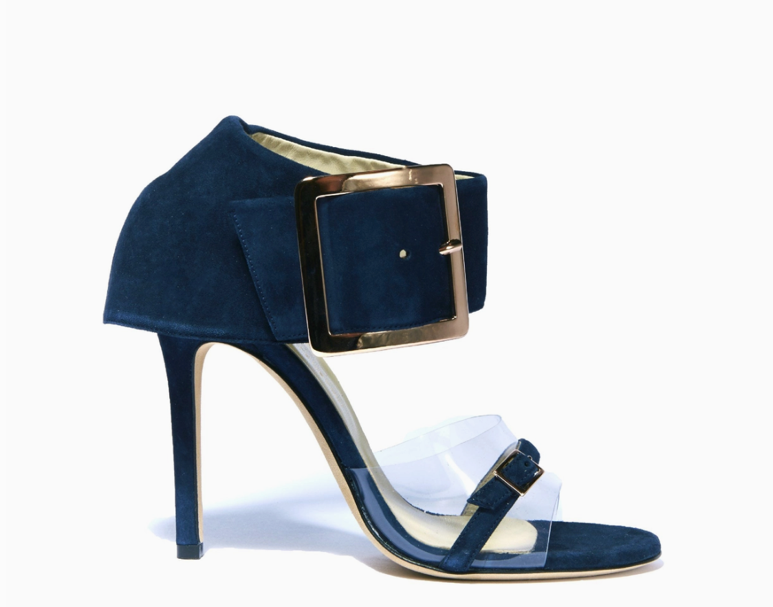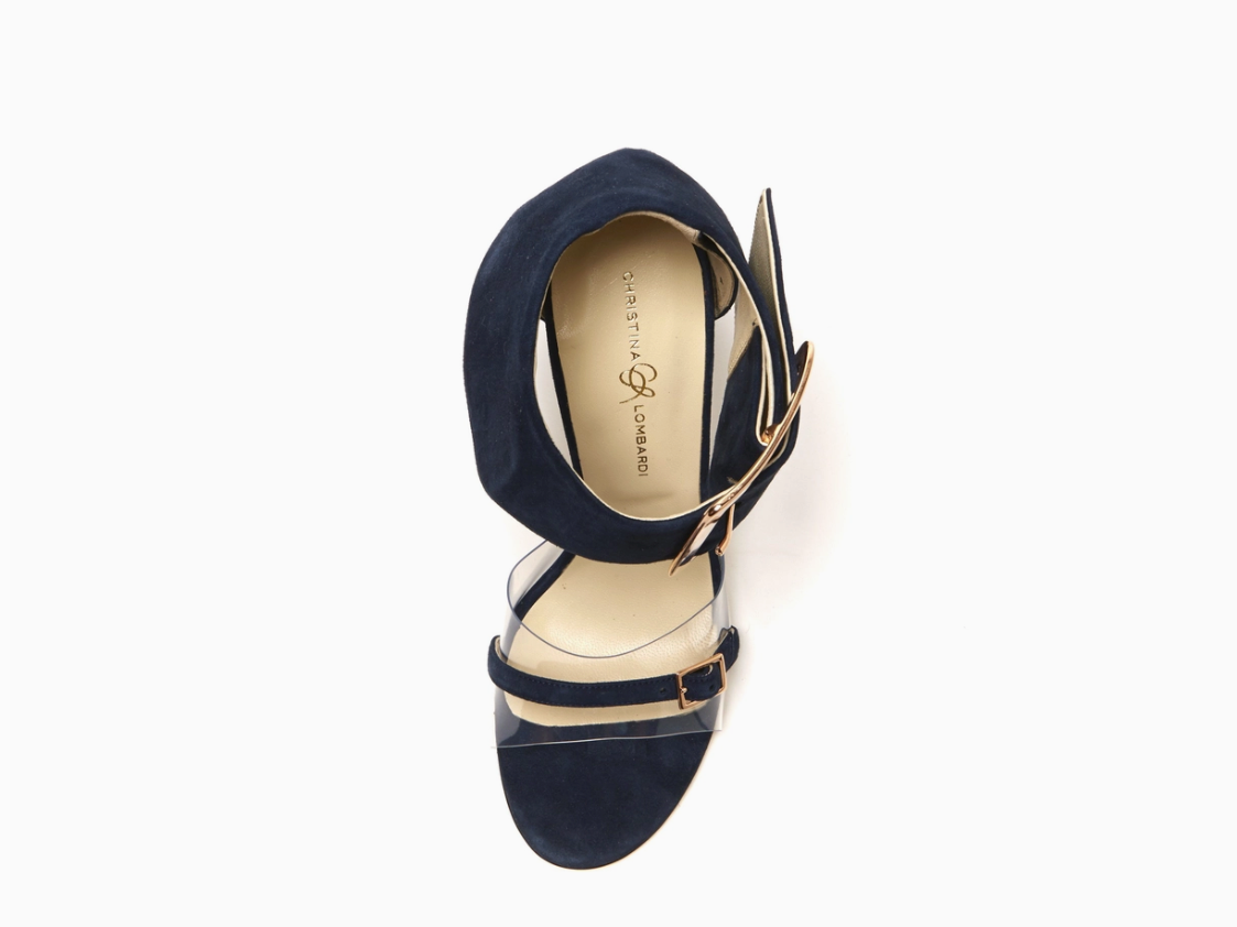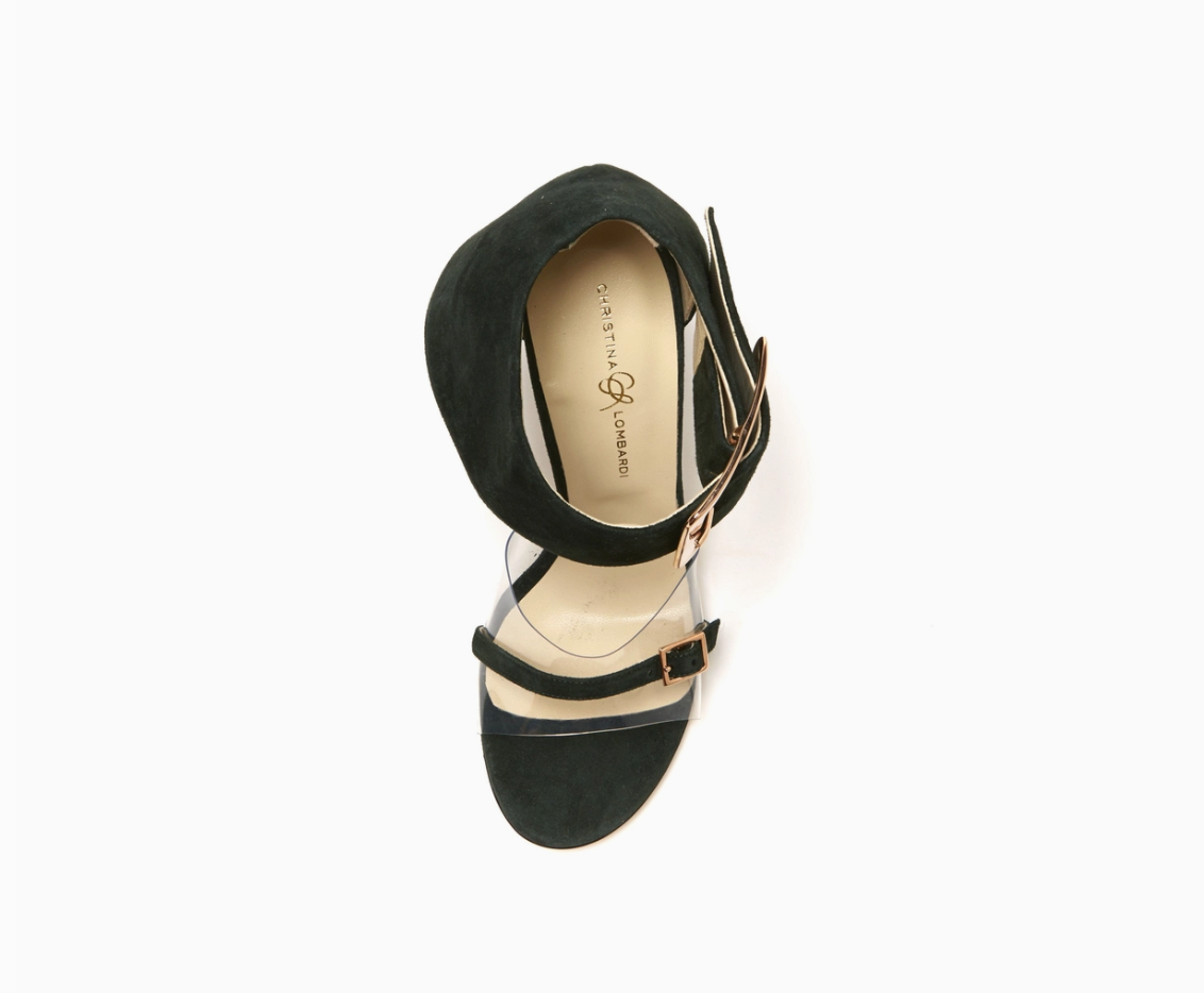 A modern, geometric twist on a classic sandal with a 105 mm wrapped heel. Handcrafted in Italy, Neeka makes a statement with our buttery kid suede, nappa, pvc and rose gold buckles.