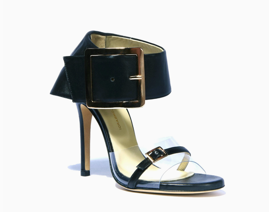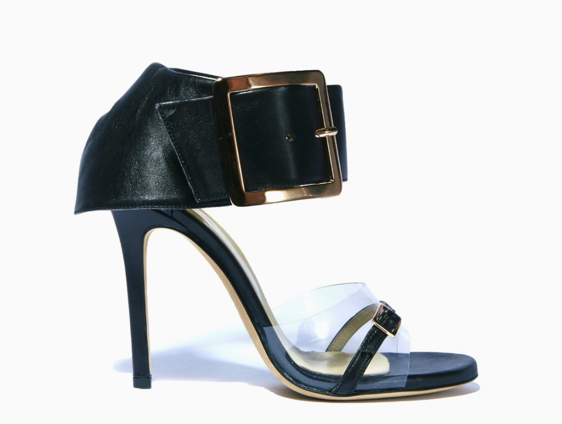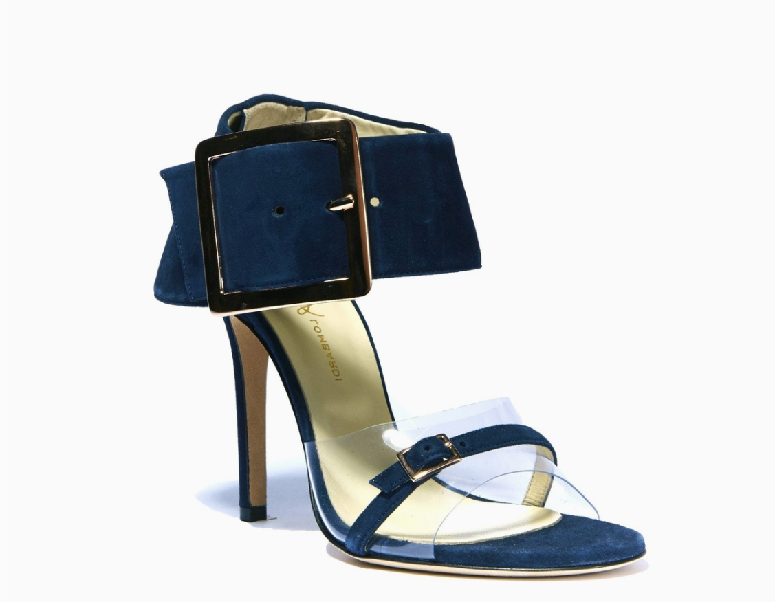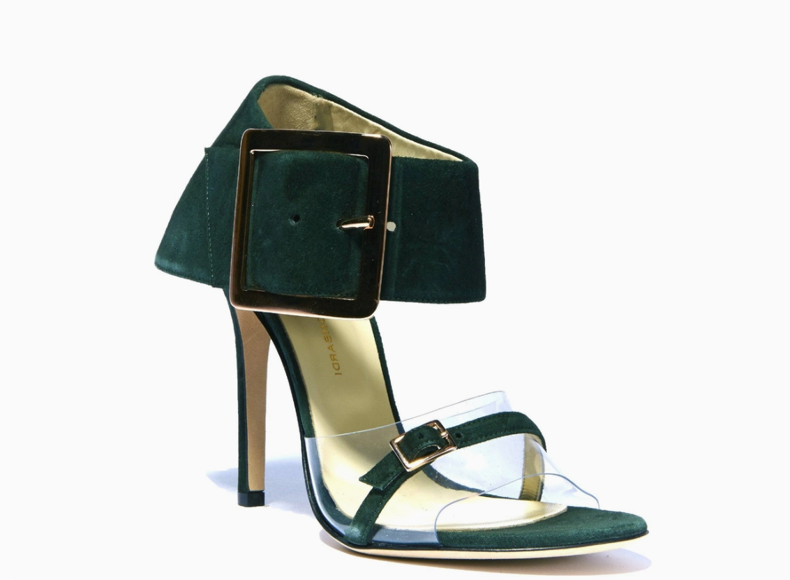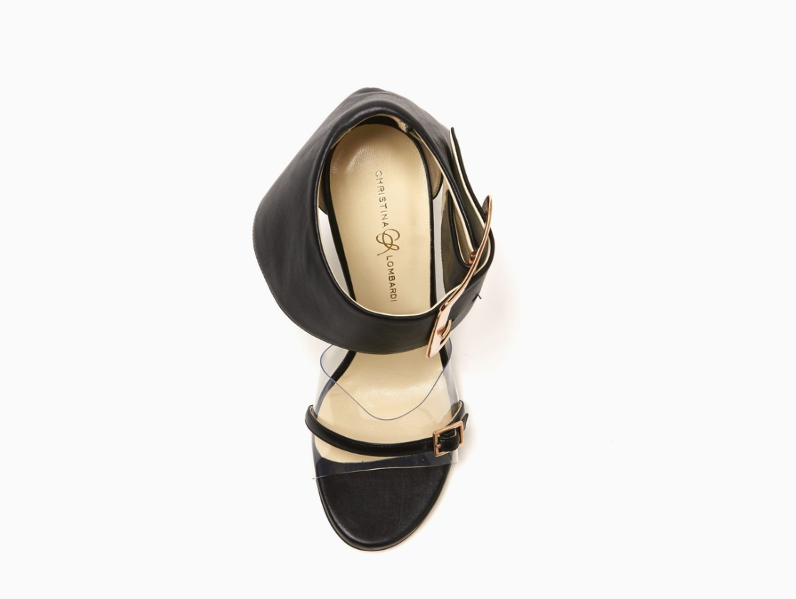 A modern, geometric twist on a classic sandal with a 105 mm wrapped heel. Handcrafted in Italy, Neeka makes a statement with our buttery kid suede, nappa, pvc and rose gold buckles.
